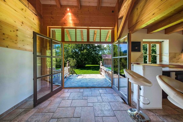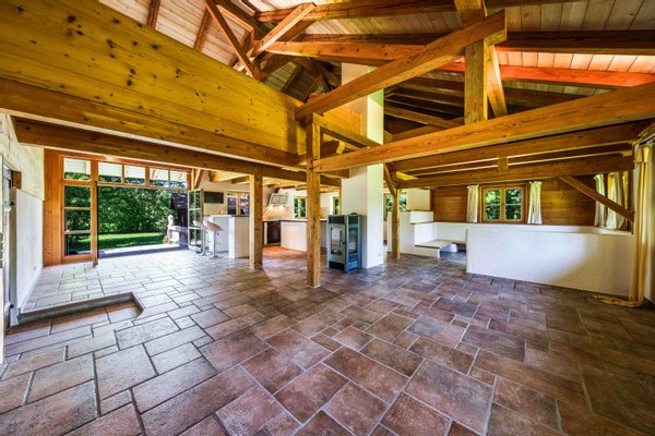 Da das Gebäude im nördlichen Teil des Grundstücks platziert wurde, ergibt sich nach Süden ein schöner Blick über freie Wiesen, eingerahmt von wertvollem altem Baumbestand, in dessen Hintergrund sich ein weitläufiges Bergpanorama erhebt.