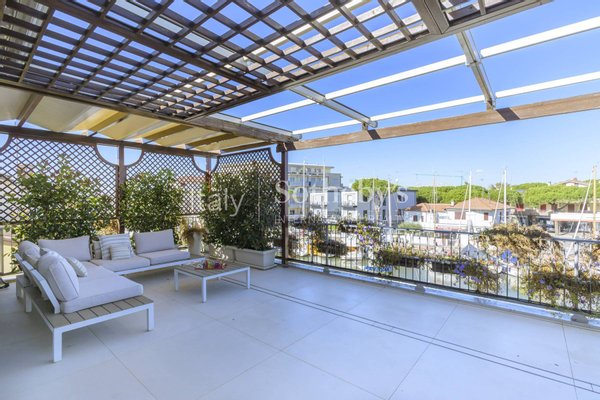 Mit Blick auf den malerischen Hafenkanal von Cervia verfügt dieses Penthouse über eine großzügige Terrasse von 50 m² - ideal, um den Blick auf den Hafen zu genießen und angenehme Momente im Freien zu verbringen.
