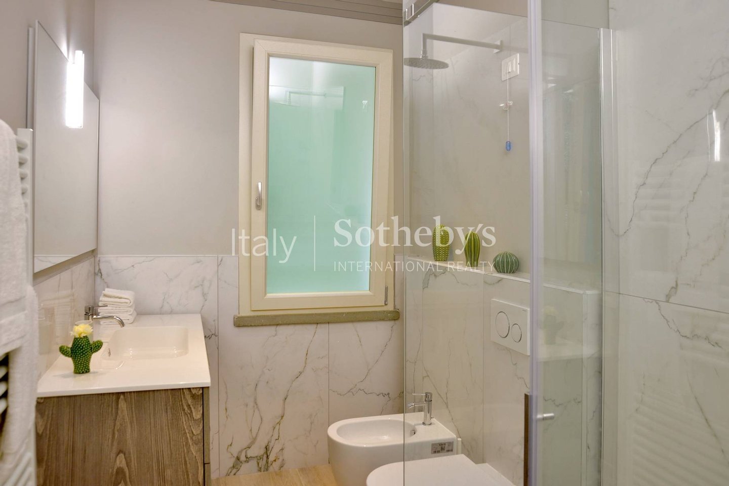The garden, enriched with Mediterranean plants, shrubs, and a well-kept lawn, can be admired from every part of the house thanks to the large windows that fill the interiors with natural light.