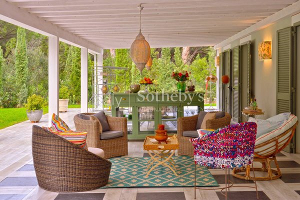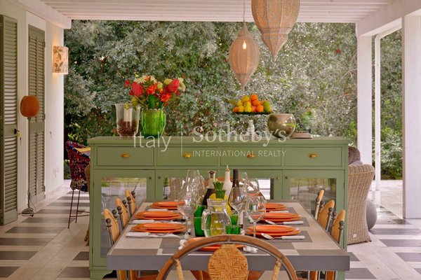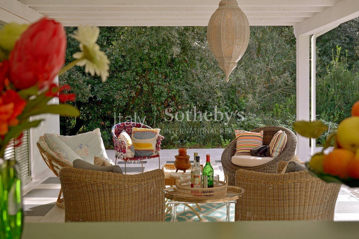 Villa La Loggia is located within a wonderful estate and features a spectacular veranda offering a spacious outdoor area. The floor, made of inlaid black marble tiles arranged in geometric patterns and set into bleached wooden planks, together with the white-beamed ceiling, gives the space an elegant colonial charm. Wicker furniture and large armchairs complete the relaxed yet sophisticated atmosphere.