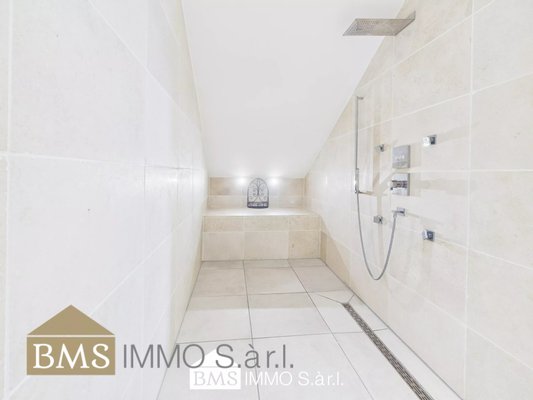 mit einer sehr geräumigen Dusche und Badewanne, sowie ein Gäste WC mit zusätzlicher Dusche. Die Bäder sind mit hochwertigem italienischem Naturmarmor ausgestattet. Ein Hauswirtschaftsraum und ein separater Abstellraum runden das Raumangebot ab.