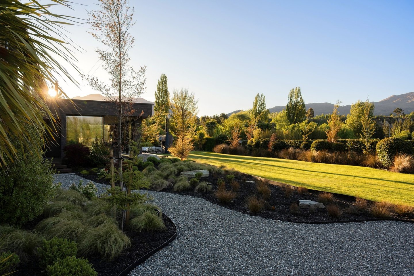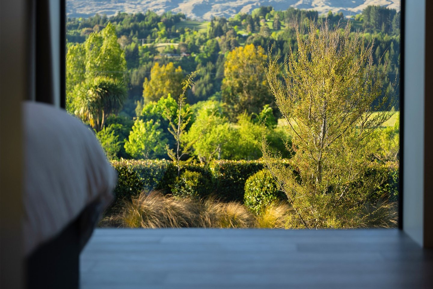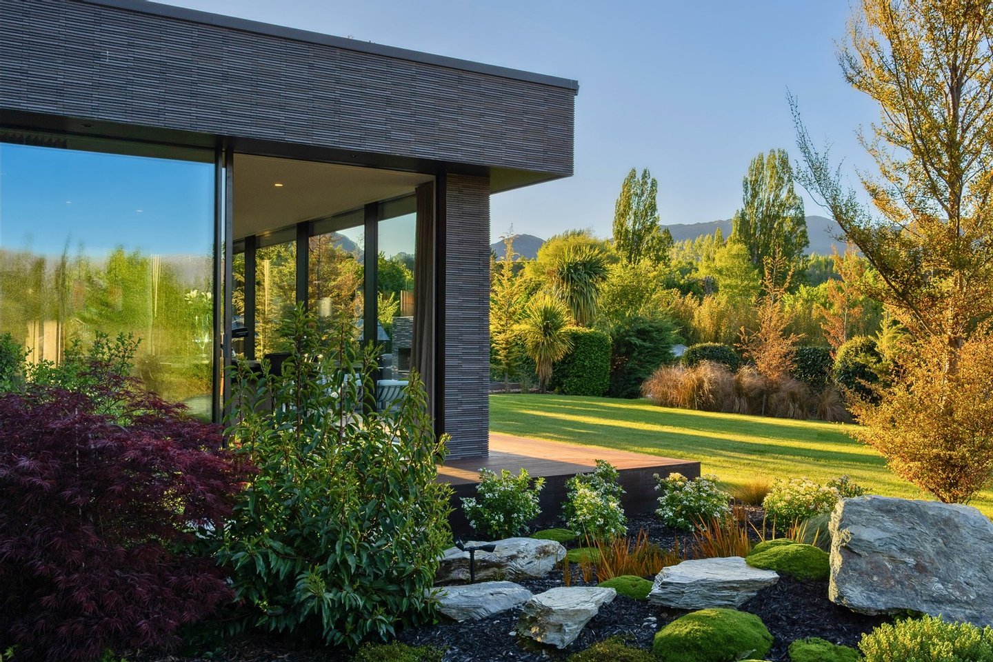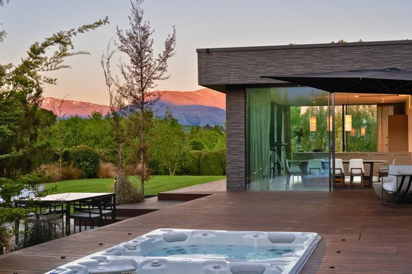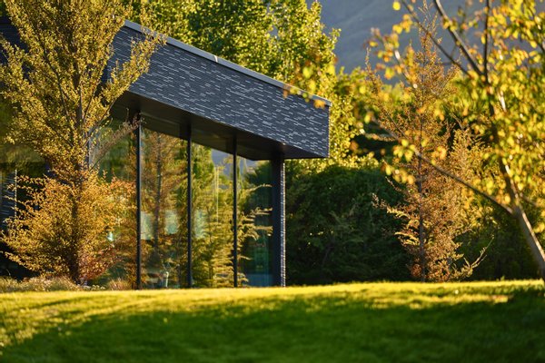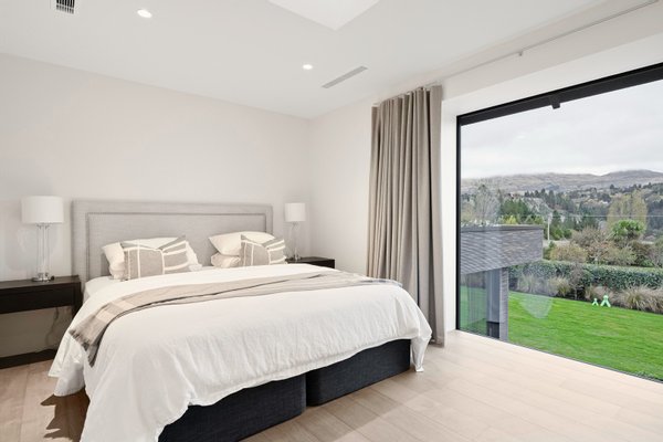 - Von der weitläufigen Master-Suite aus ist ein begrüntes Dach mit einheimischer Flora bepflanzt, die auf die alpine Vegetation des herrlichen Coronet Peak abgestimmt ist, der dahinter zu sehen ist.