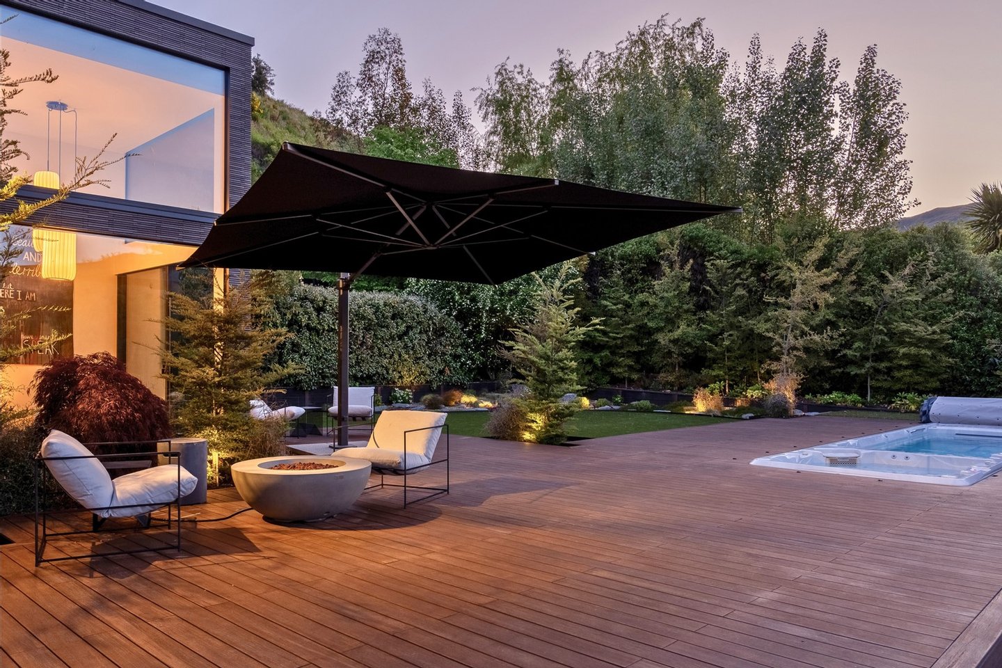 - Zu den weitläufigen Unterhaltungs- und Wohnbereichen im Freien gehören ein im Boden eingelassenes Swim-Spa, ein Kamin, einheimische Gärten und gepflegte Rasenflächen.