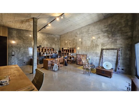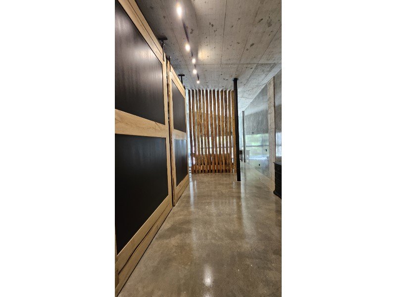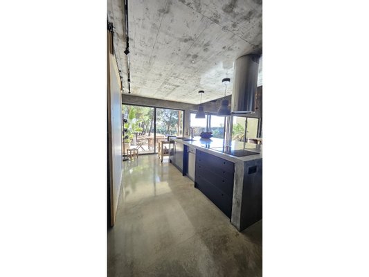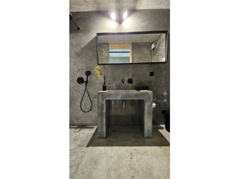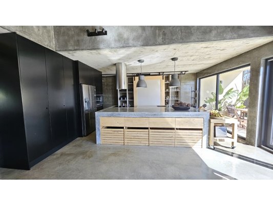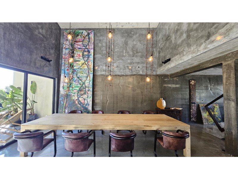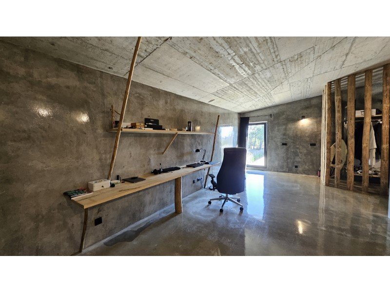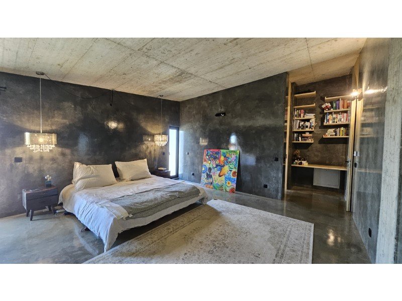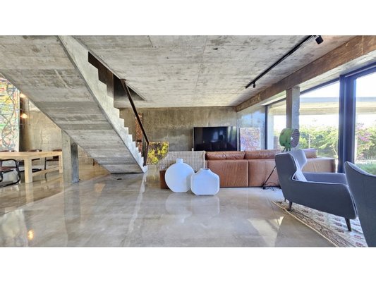Im Herzen dieses majestätischen Raumes befindet sich eine atemberaubende Treppe aus poliertem Beton, ein wahres architektonisches Merkmal, die den Raum anmutig durchquert und beide Ebenen verbindet.