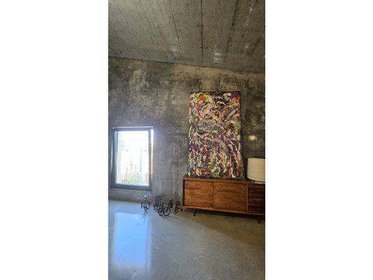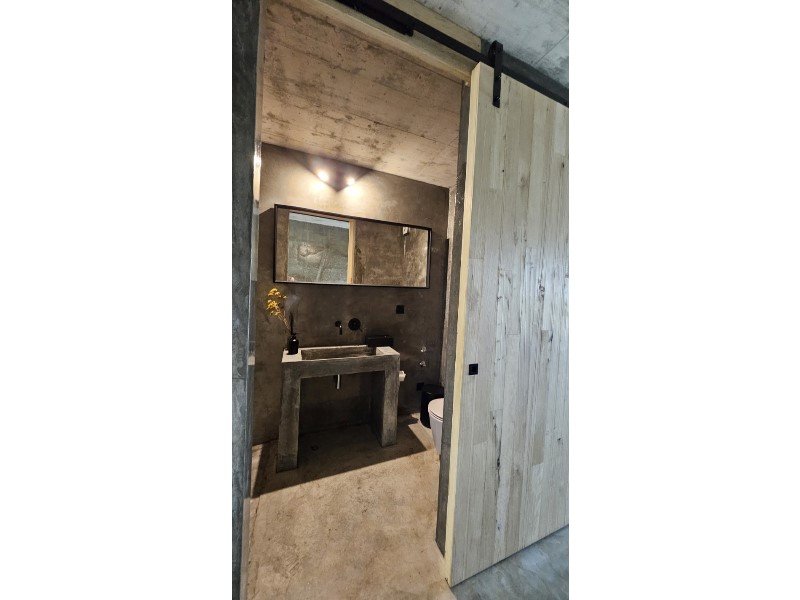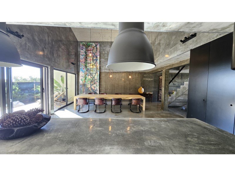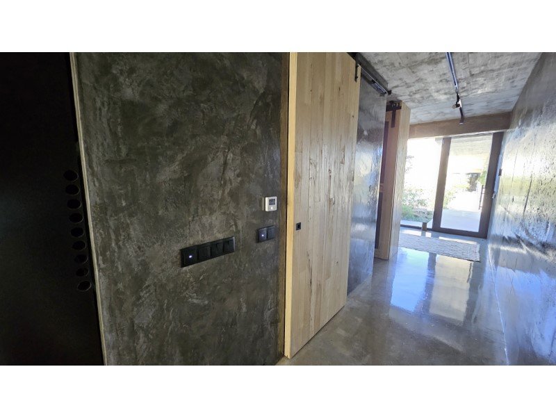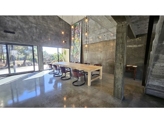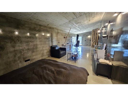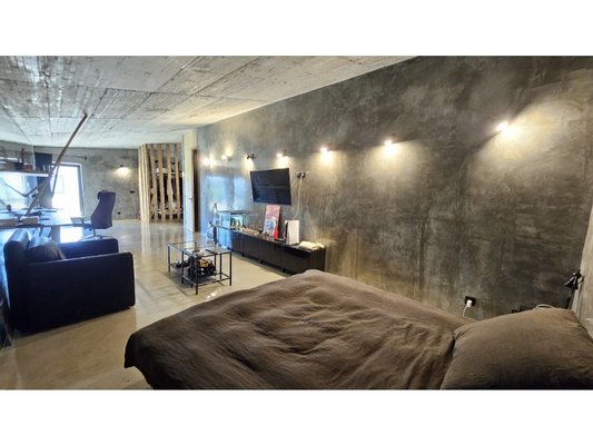 Im Herzen dieses majestätischen Raumes befindet sich eine atemberaubende Treppe aus poliertem Beton, ein wahres architektonisches Merkmal, die den Raum anmutig durchquert und beide Ebenen verbindet.