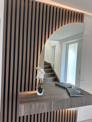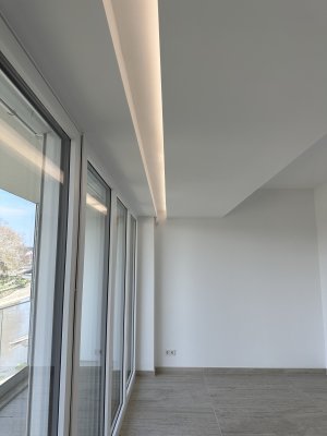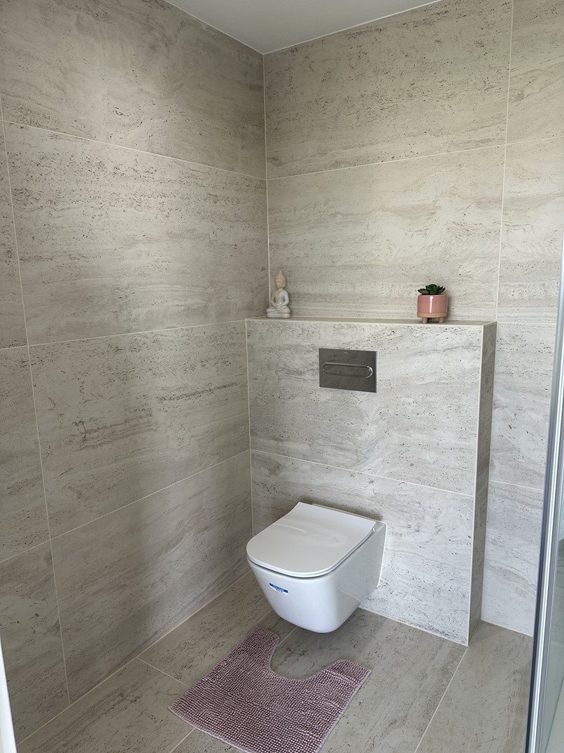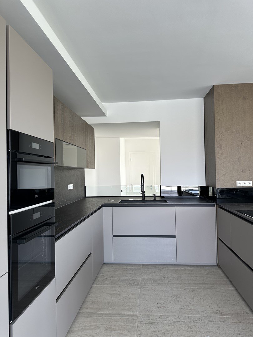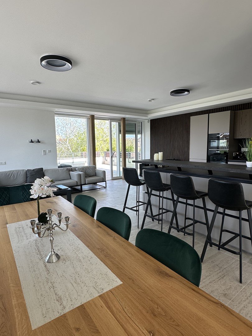 Die obere Ebene der Wohnung verfügt über ein großes Wohnzimmer-Küche-Esszimmer und eine Toilette.