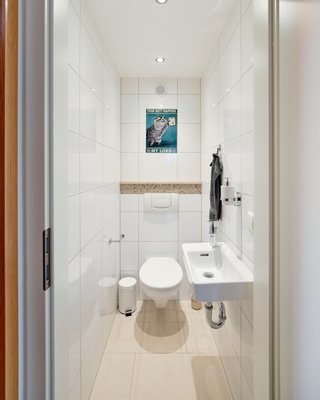 Das große Badezimmer ist hochwertig ausgestattet mit Dusche, Badewanne, Bidet und WC. Ein separates Gäste-WC sorgt für zusätzlichen Komfort im Alltag.