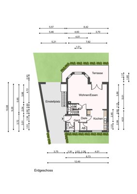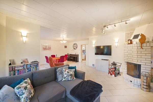 Im Erdgeschoss empfängt Sie ein heller Eingangsbereich mit Gäste-WC. Von hier aus gelangen Sie in die gemütliche Küche sowie in das weitläufige Wohn- und Esszimmer mit Kamin und Zugang zur überdachten Terrasse. Von dort öffnet sich der Blick in den gepflegten Garten – perfekt zum Entspannen, Spielen oder für gesellige Stunden im Grünen.