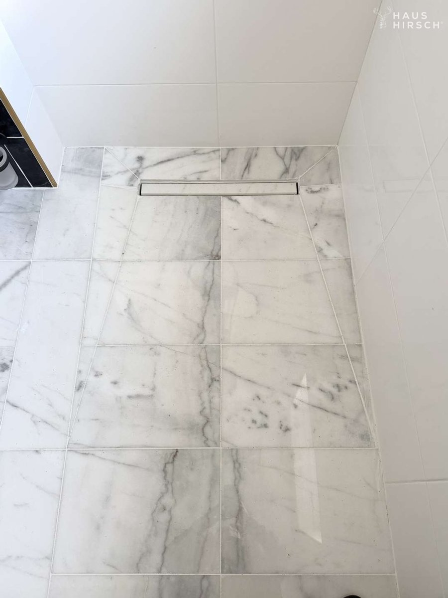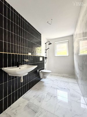 Wenige Schritte weiter, ebenfalls auf der rechten Seite, liegt das moderne Duschbad mit komfortabler, begehbarer Dusche. Die stilvolle Ausstattung und klare Linienführung schaffen ein gepflegtes, zeitgemäßes Ambiente.