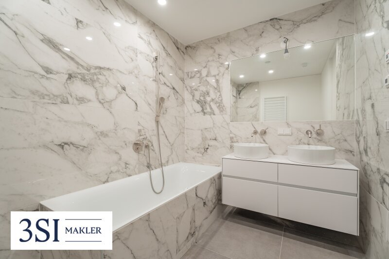 - Badezimmer mit Badewanne, zwei Handwaschbecken und Waschmaschinenanschluss (ca. 6,5 m²)