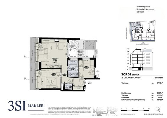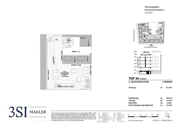Die 3-Zimmer-Wohnung befindet sich im 2. Dachgeschoss und bietet eine Wohnfläche von ca. 67 m² sowie eine Terrasse mit ca. 12 m² und eine private Dachterrasse mit ca. 36 m².