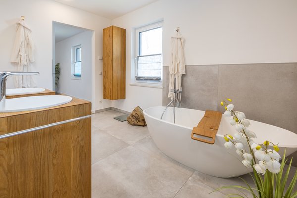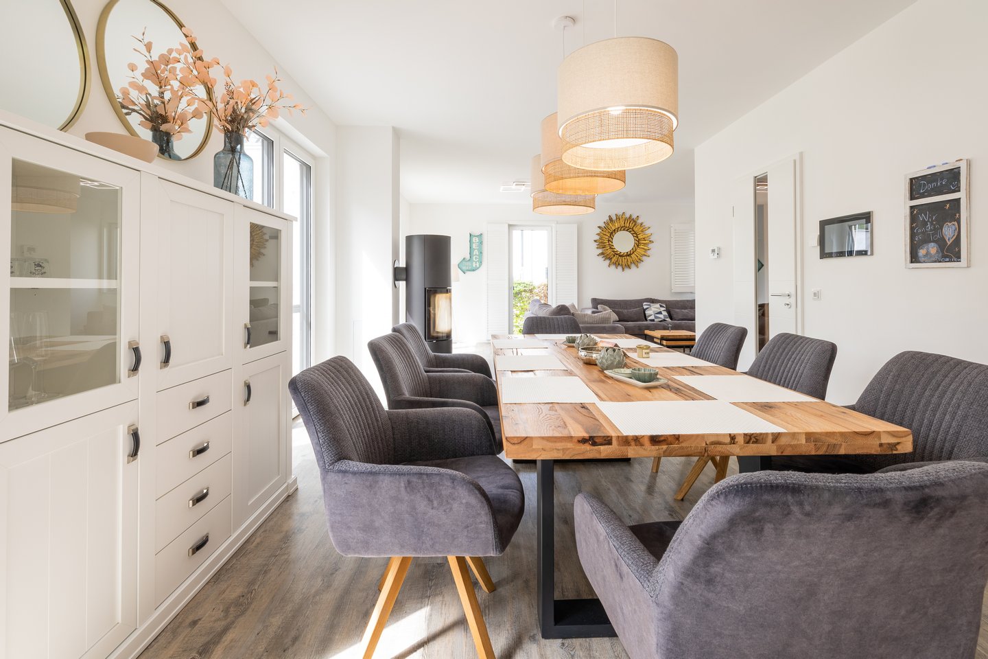 Ihr neues Traumhaus im Bauhausstil: Design, Komfort & Nachhaltigkeit in Vollendung. Schon beim Betreten empfängt Sie klare Architektur, viel Licht und ein Gefühl von Weite. Auf 160 m² Wohnfläche, verteilt auf zwei Ebenen, genießen Sie ein offenes, modernes Raumkonzept mit bodentiefen Fenstern und fließendem Übergang in den Garten. Das Erdgeschoss bildet der großzügige Wohn-/Ess- und Kochbereich mit hochwertiger Einbauküche. Zusätzlich: elegantes Gästebad, Hauswirtschaftsraum und Technikbereich im direkt angebundenen Anbau. Im Obergeschoss: drei flexibel nutzbare Zimmer (Schlafzimmer, Kinderzimmer, Homeoffice) sowie zwei komfortable Bäder. Ein Highlight: Ihre eigene Außensauna als privater Rückzugsort. Der parkähnliche Garten auf 952 m² mit 60 m² Südterrasse lädt zu entspannten Sommerabenden ein – inkl. fest installiertem Gasgrill. Technisch spielt das Haus in der Zukunftsliga: Erdwärmepumpe, PV-Anlage mit Speicher, E-Ladestation, Endenergiebedarf nur 11 kWh/(m²*a), KfW-40 A+. Dazu Fußbodenheizung und -kühlung, aktive Umluftanlage, Wasserenthärtung/-enteisenung, Smarthome, Gartenbewässerung über Brunnen, elektrische Rollläden, Insektenschutz, SAT, DSL 100 Mbit/s. Und: Das Haus wird komplett möbliert übergeben – inkl. Waschmaschine, Trockner etc. Ein elektrisches Gartentor öffnet Ihnen die Zufahrt.