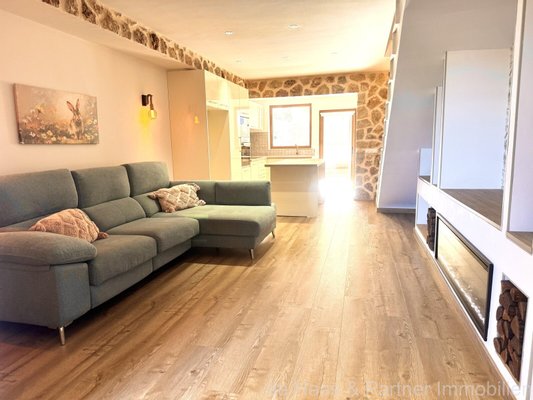 Erdgeschoss: Wohn-Essbereich mit gemütlicher Sofaecke und Kamin (elektrisch), offene Küche mit Theke und Bosch Geräten, Gäste-WC mit nagelneuem Warmwasserboiler, sowie einer Entkalkungsanlage.