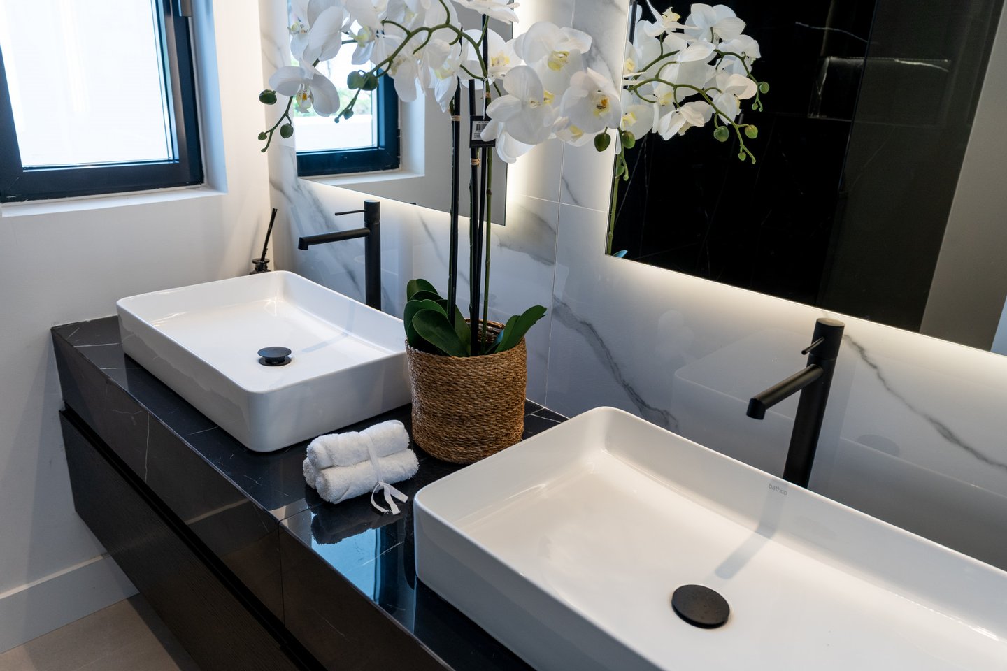 Diese bemerkenswerte Villa verfügt über 5 Schlafzimmer und 4 + 1 Badezimmer, sowie ein einladendes Büro, eine Dachterrasse, eine großzügige und gut ausgestattete Küche und einen geräumigen Wohn-Essbereich, der sich zu einer großen Terrasse im Erdgeschoss hin öffnet.