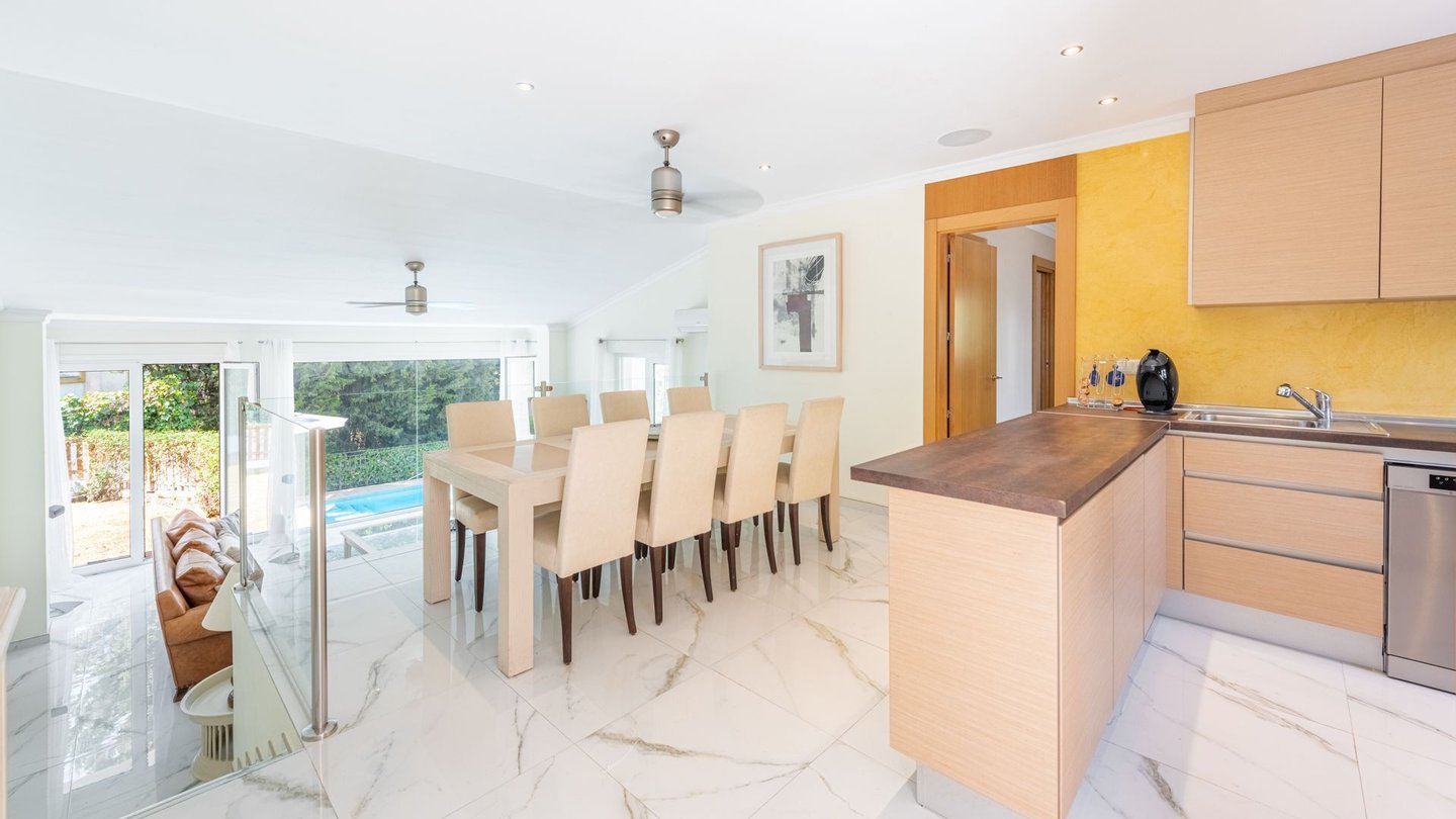 Die Eingangshalle führt zum Esszimmer mit offener moderner Küche und dem Wohnzimmer. Vom Wohnzimmer aus haben Sie direkten Zugang zum Garten und dem Pool.
