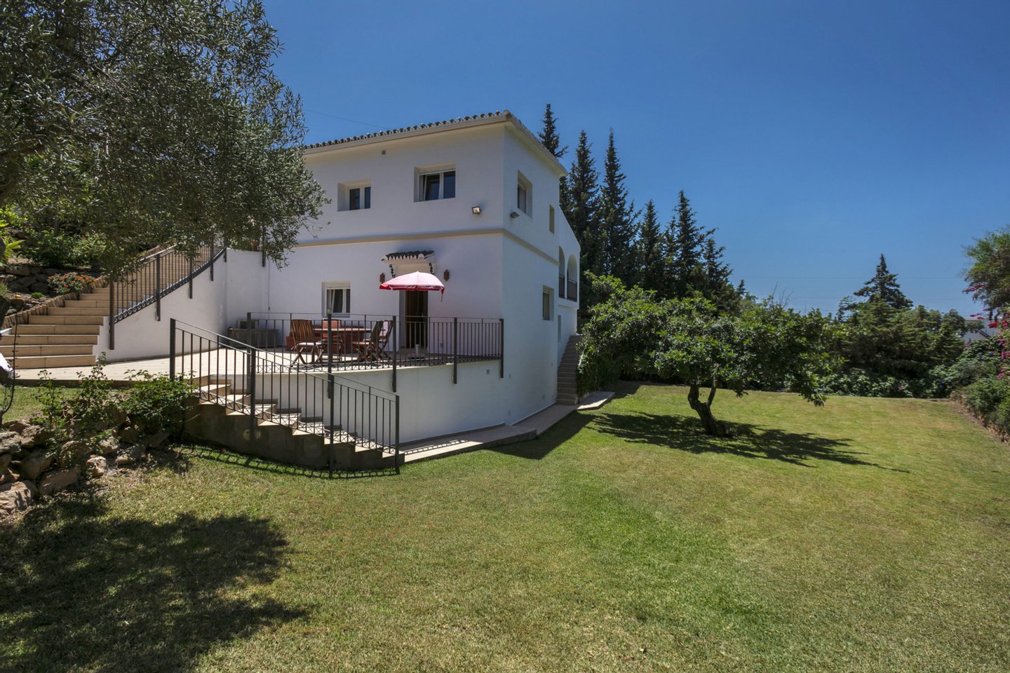 Die Villa ist umgeben von einem sehr gepflegten Garten mit einem großen Pool. Zur weiteren Ausstattung gehören Fußbodenheizung in den Bädern, Sonos-Soundsystem, Grillplatz und verschiedene Terrassen.