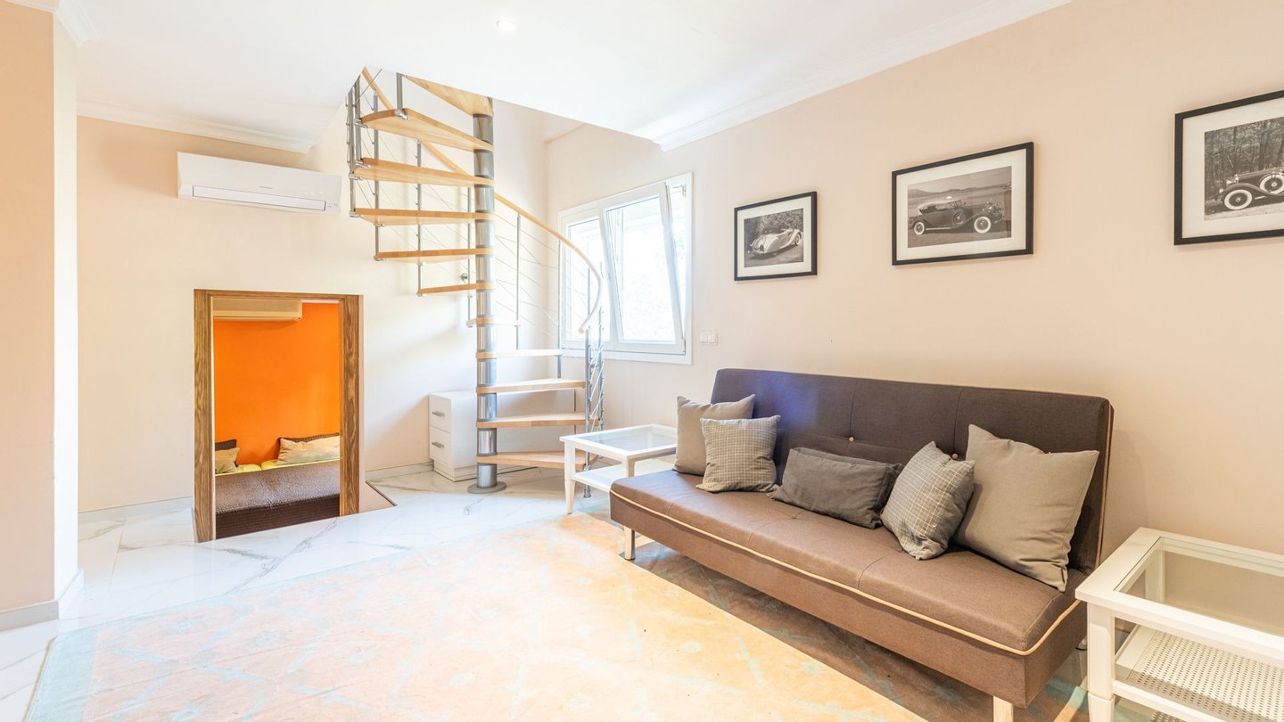 Eine separate Gästewohnung kann von innen über eine Wendeltreppe oder direkt von außen über einen separaten Eingang erreicht werden. Die Gästewohnung verfügt über ein Wohnzimmer mit offener moderner Küche, 1 Schlafzimmer und ein Bad.