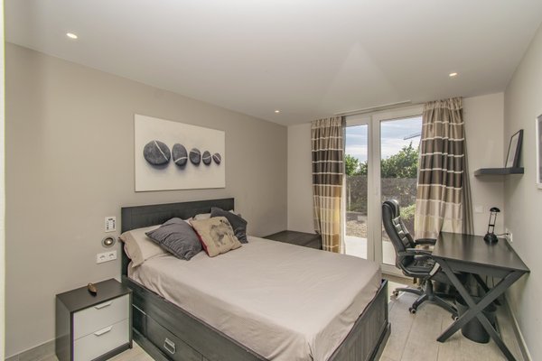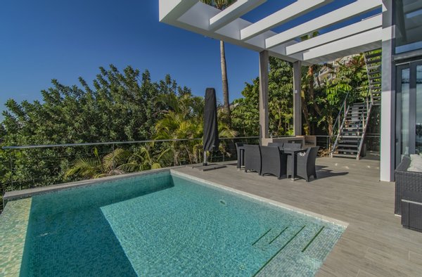 Steigen Sie auf die obere Ebene, um ein 25m2 großes Solarium mit atemberaubendem Panoramablick auf das Meer zu entdecken. Genießen Sie im Außenbereich den privaten Pool und den praktischen Parkplatz für bis zu vier Autos.