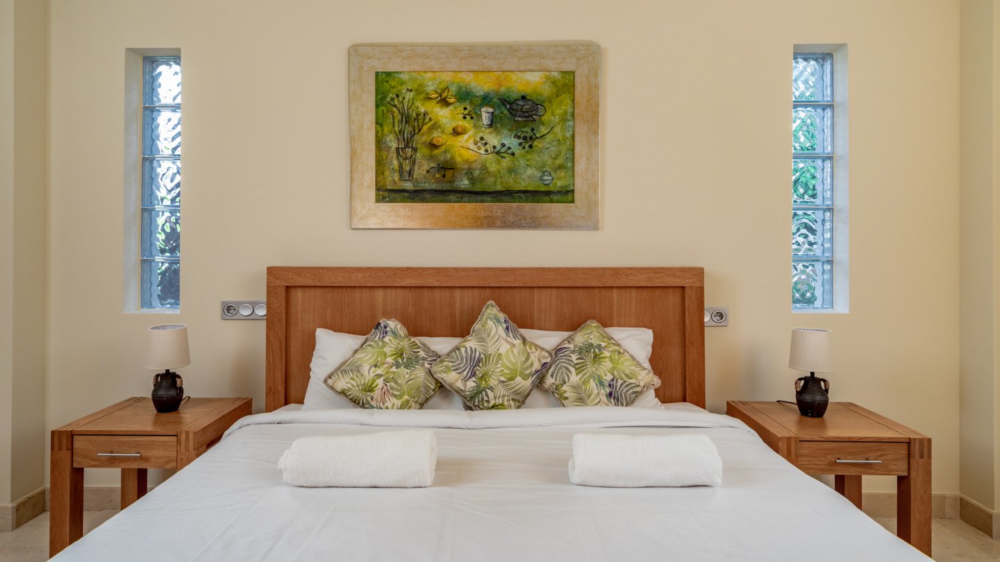 Wohn-/Esszimmer, voll ausgestattete Küche, Hauptschlafzimmer mit eigenem Bad und ein Gästezimmer mit Bad. Direkter Zugang zur Terrasse. Abstellraum und Parkplatz.