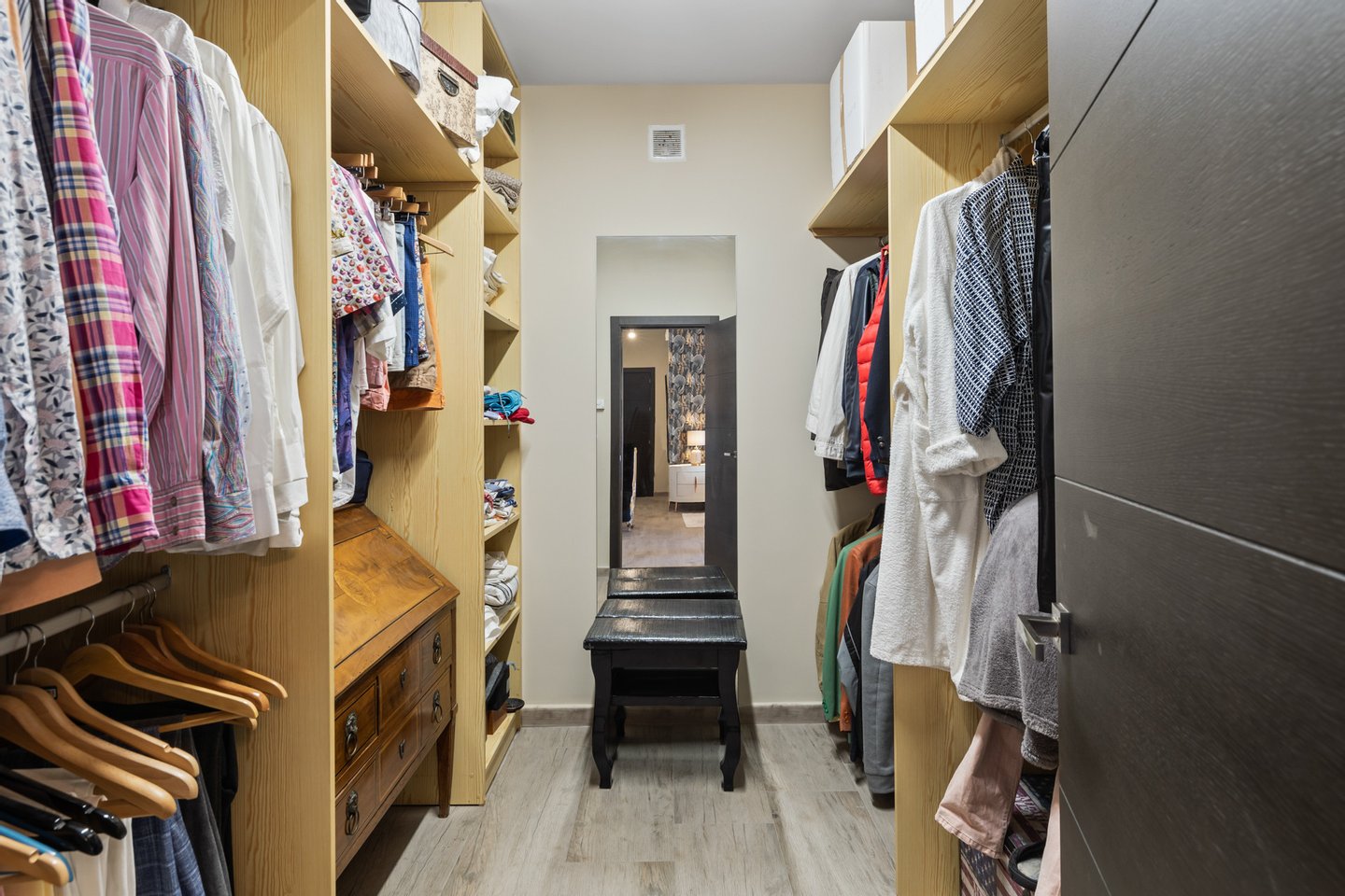 Im Obergeschoss befindet sich das Hauptschlafzimmer mit eigenem Bad, zwei Ankleidebereichen und einer angrenzenden Sitzecke sowie einer charmanten Terrasse, von der aus man die spektakuläre Aussicht genießen kann.