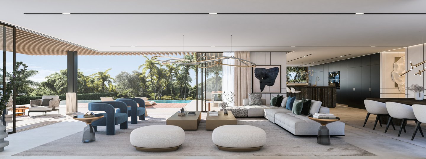 Jede Villa verkörpert eine zeitgenössische Ästhetik, die sich durch großzügige, offene Wohnräume auszeichnet, die nahtlos in die exquisit gestalteten Küchen integriert sind. Die luxuriös ausgestatteten Master-Suiten bieten geräumige, begehbare Ankleideräume und en-suite Badezimmer, während die modernen Terrassen und Poolbereiche von grünen Gärten und großen Steineinfassungen umgeben sind.