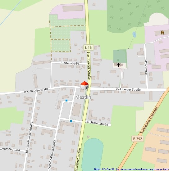 Straßen Crivitz–Goldberg und Parchim–Sternberg 34 km östlich von Schwerin und 20 km nördlich von Parchim.