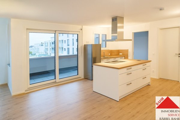 Der offene Wohn- und Essbereich beeindruckt mit Großzügigkeit und Helligkeit. Die moderne Einbauküche mit zentraler Kochinsel bildet den Mittelpunkt des Wohnraums – hier lässt sich nicht nur hervorragend kochen, sondern auch gemeinsam genießen und verweilen. Große Fensterflächen schaffen eine freundliche Atmosphäre und sorgen für lichtdurchflutete Räume.