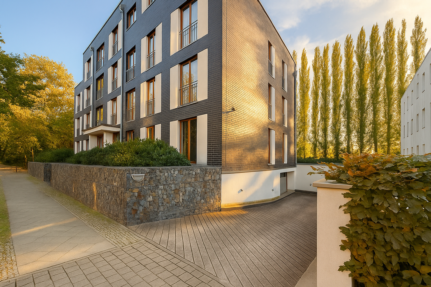 Sie betreten ein gepflegtes Mehrfamilienhaus (Baujahr 2008) mit lediglich acht Wohneinheiten, welche sich über drei Etagen erstrecken. Die elegante Fassade aus anthrazitfarbenem Klinker verleiht dem Gebäude eine zeitlos-moderne Ausstrahlung. Ein Aufzug verbindet die Tiefgarage mit allen Ebenen und bringt Sie barrierefrei direkt bis vor Ihre Wohnungstür.
