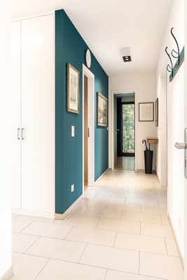 Bereits beim Betreten empfängt Sie ein großzügiger Flur, von dem aus Sie das Gäste-WC, die drei Wohnräume sowie das stilvolle Badezimmer erreichen. In der Wohnküche und im Flur sorgen helle, beigefarbene Fliesen für ein freundliches Ambiente, während im Wohn- und Schlafbereich edles Echtholz-Eichenparkett in klassischer Stäbchenoptik eine warme, behagliche Atmosphäre schafft.