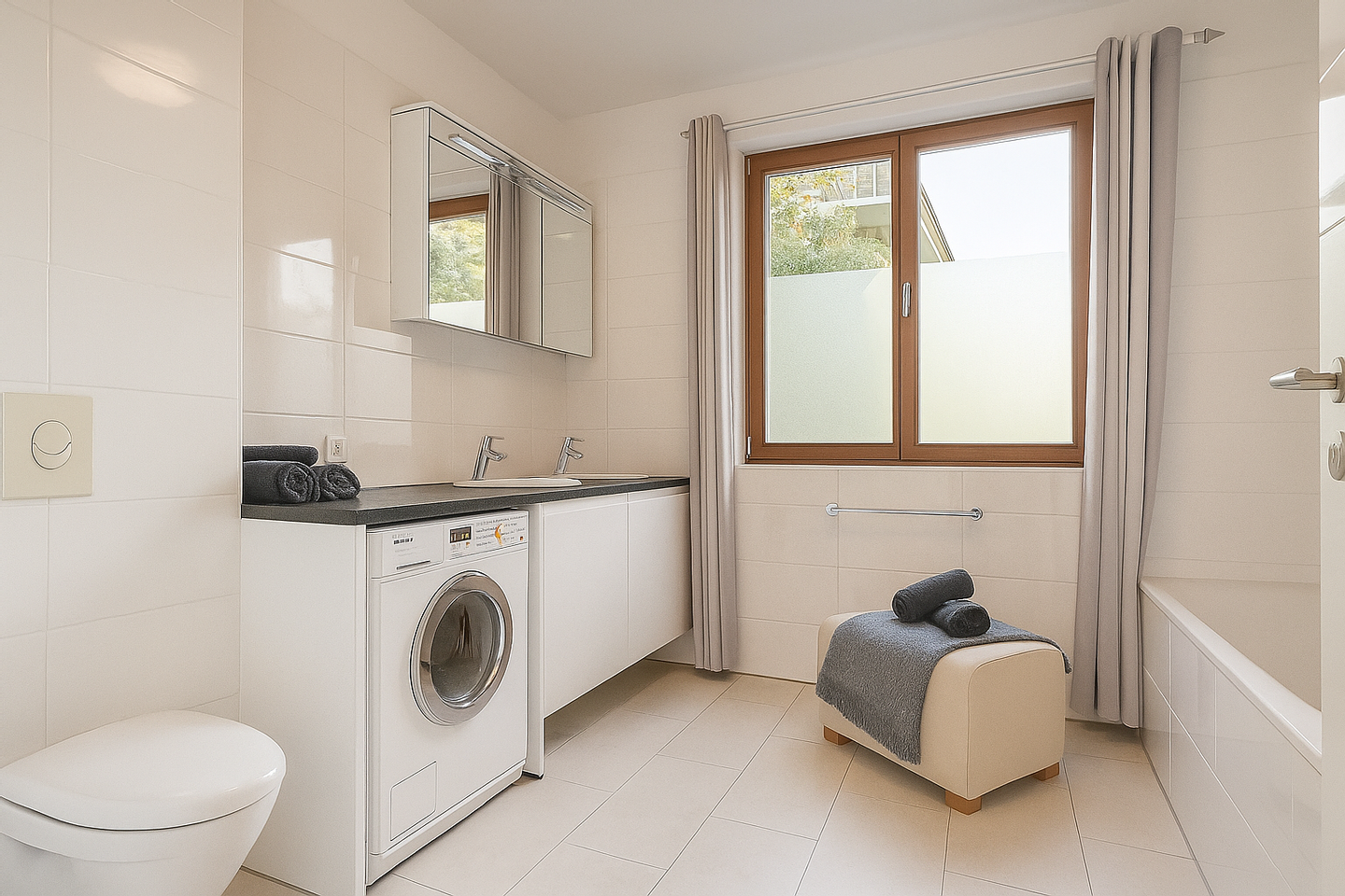 Das lichtdurchflutete Badezimmer überzeugt mit moderner Ausstattung: Badewanne, Dusche, Waschtisch und WC bieten Ihnen höchsten Komfort und ein rundum stimmiges Wohlfühlambiente.
