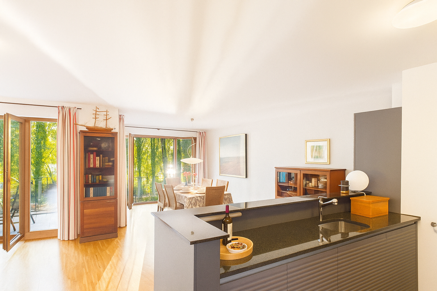 Bodentiefe, doppelt verglaste Holzfenster durchfluten die Räume mit natürlichem Licht und eröffnen einen wunderschönen Blick ins Grüne. Besonders hervorzuheben ist die einmalige Lage der Wohnung: Sie befindet sich in erster Reihe zum Rummelsburger See und bietet Ihnen einen unverbaubaren, nicht einsehbaren Blick auf das glitzernde Wasser – ein Panorama, das Ihnen täglich ein Gefühl von Weite und Ruhe schenkt.