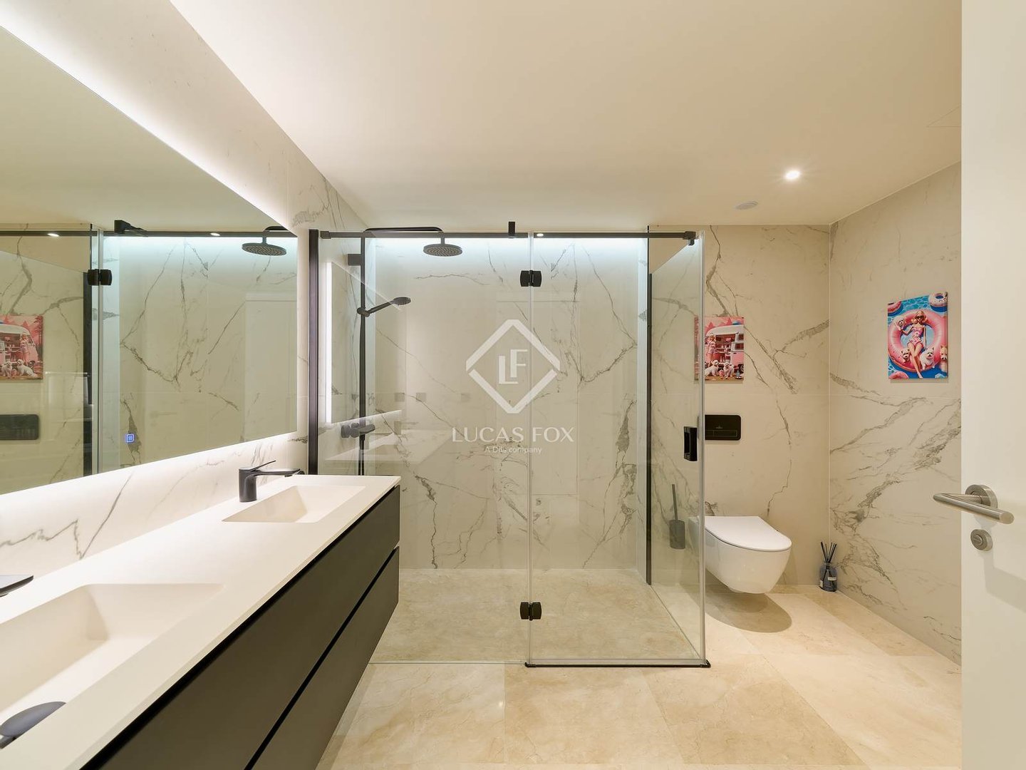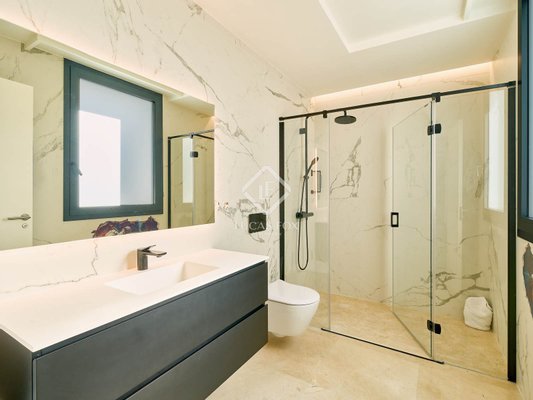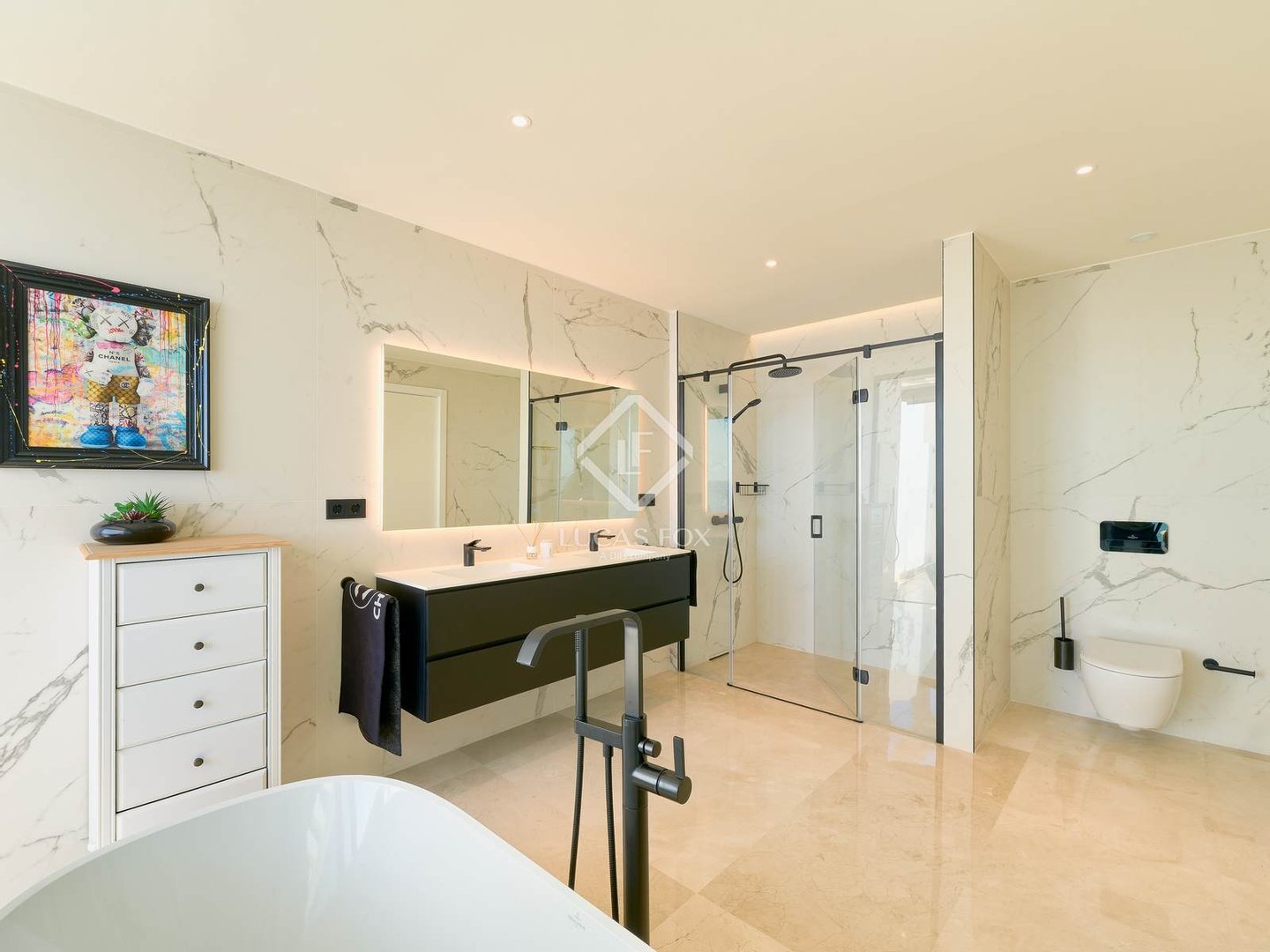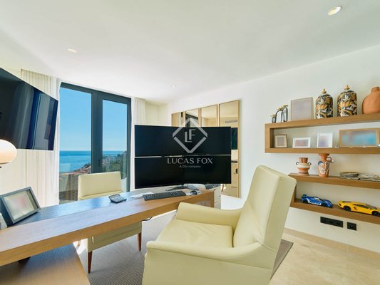 The upper floor features a night area dominated by a majestic 35 m² main bedroom with a private bathroom with a bathtub and shower, a dressing room, and a private terrace with a Jacuzzi offering spectacular views of the Mediterranean. The other two bedrooms, both with private bathroom and built-in wardrobes, share a terrace. Finally, an elegant office completes this level, ideal for teleworking.