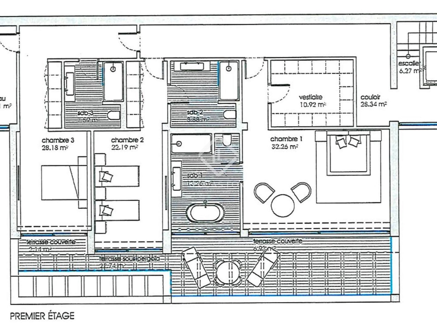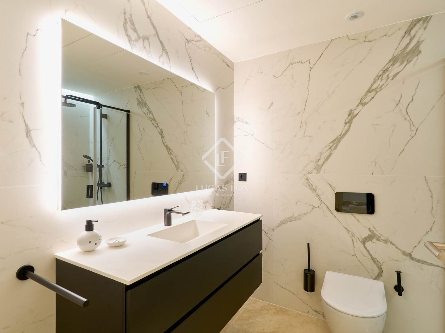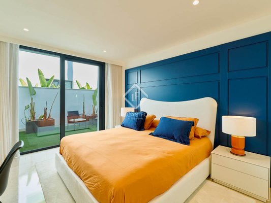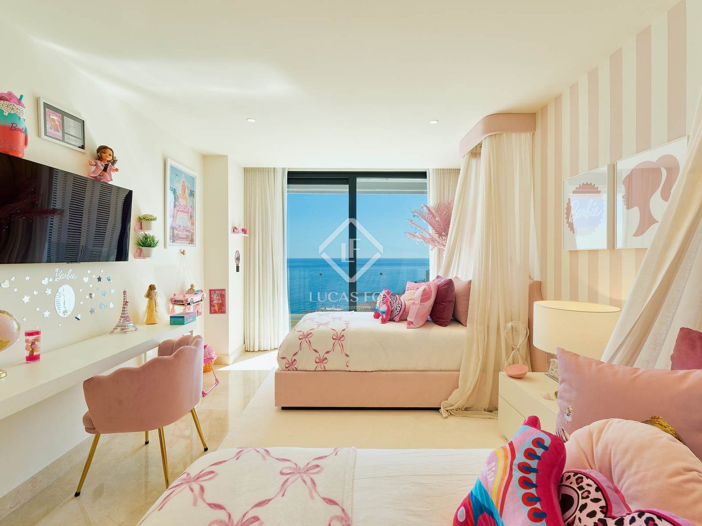 The upper floor features a night area dominated by a majestic 35 m² main bedroom with a private bathroom with a bathtub and shower, a dressing room, and a private terrace with a Jacuzzi offering spectacular views of the Mediterranean. The other two bedrooms, both with private bathroom and built-in wardrobes, share a terrace. Finally, an elegant office completes this level, ideal for teleworking.