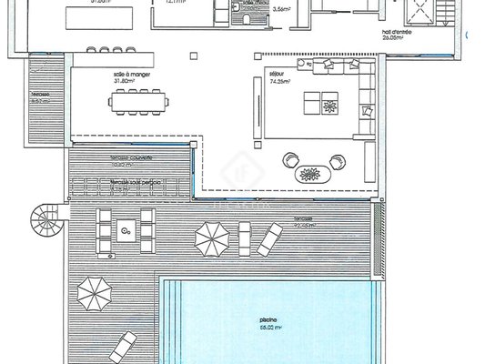 On the main floor , there is a spacious, designer day area of almost 140 m², comprising a living room, dining room , and open-plan kitchen equipped with Miele appliances . It features enormous floor-to-ceiling windows that allow in abundant natural light and open onto a terrace of over 100 m² with a beach-effect infinity pool overlooking the sea. On this same level, there is a guest bathroom , a laundry room room, and a dressing room.