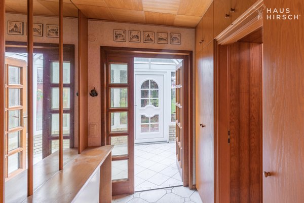 Sie betreten die Immobilie und dem Uhrzeigersinn folgend finden Sie das Gäste-WC, die Treppe ins Obergeschoss, das große Wohnzimmer mit angeschlossenem Wintergarten sowie die Essküche vor.