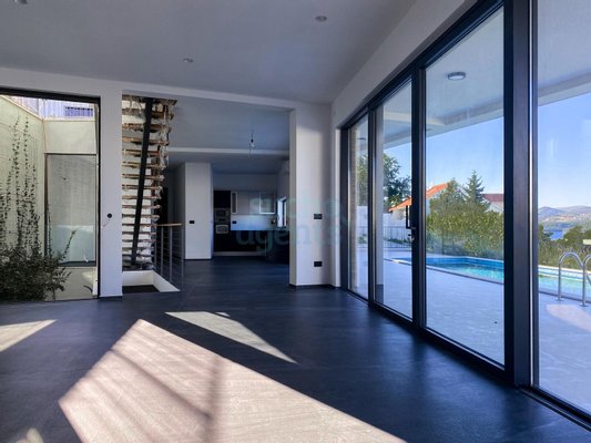 Die Villa zeichnet sich durch ihre außergewöhnliche Bauweise aus, mit einer Fassade aus Travertin und robustem Stahlbeton. Die Innengestaltung besticht durch Ziegelwände und Parkettböden, die einen Hauch von Eleganz verleihen. Die PSK-Fenster und -Türen mit Aluminiumrahmen sorgen für optimale Lichtverhältnisse und unterstreichen das moderne Designkonzept.