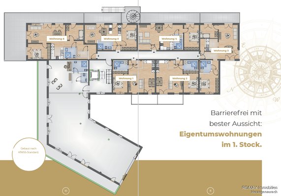 Die Wohnung befindet sich in einer modernen Wohnanlage mit nur 16 Einheiten, die durch ein innovatives Wohnkonzept besticht: Neben klassischen Wohnungen umfasst sie eine Tagespflege, eine ambulant betreute Wohngemeinschaft, sowie ein Gesundheitszentrum mit einer neurogeriatrischen Therapiepraxis. Dadurch entsteht ein besonders sicheres und komfortables Wohnumfeld, das Wohnen im Alter und betreutes Wohnen ideal kombiniert.