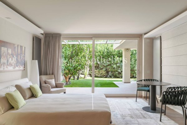 Completing the property are a spacious independent suite with direct garden access, laundry and service rooms, an internal elevator, a large garage, and private parking spaces.