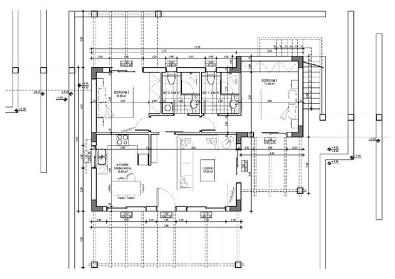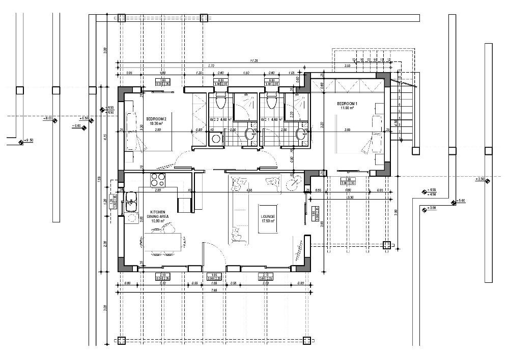 Jede Villa besteht aus 2 Doppelzimmern mit Einbauschränken und Zugang zu überdachten Terrassen, eines der Schlafzimmer mit eigenem Duschbad, einem gemeinsamen Duschbad, einer Einbauküche mit Essbereich und Keramikfliesen sowie Zugang zu einer überdachten Terrasse und einem Wohnzimmer.