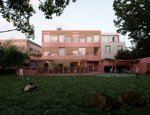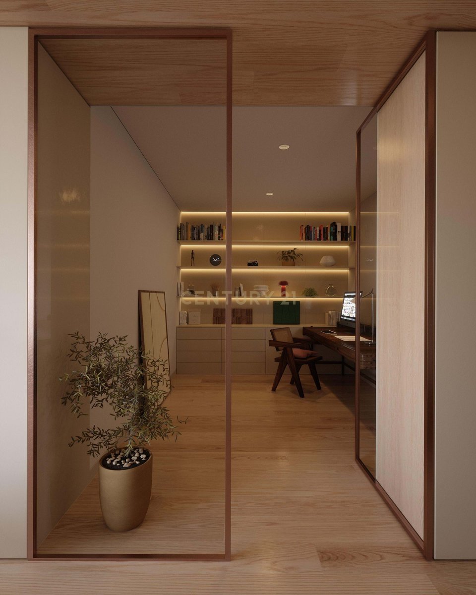 Das großzügige Wohnzimmer erstreckt sich zu einem Balkon mit herrlicher Aussicht und führt zu einer großen Terrasse, die sich perfekt zum Entspannen und geselligen Beisammensein mit Familie und Freunden eignet. Das Design maximiert das natürliche Licht, mit großen verglasten Öffnungen und minimalistischen Fensterrahmen, die eine helle, raffinierte und einladende Atmosphäre schaffen.