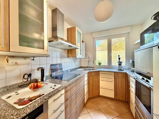 Die offene Nolte-Küche ist ein echtes Highlight: ausgestattet mit einer edlen Granit-Arbeitsplatte und hochwertigen Elektrogeräten, macht sie das Kochen zum Genuss. Ergänzt wird das Erdgeschoss durch praktische Rollläden an den Fenstern sowie ein in 2021 modernisiertes Gäste-WC, das mit stilvollen Akzenten überzeugt.