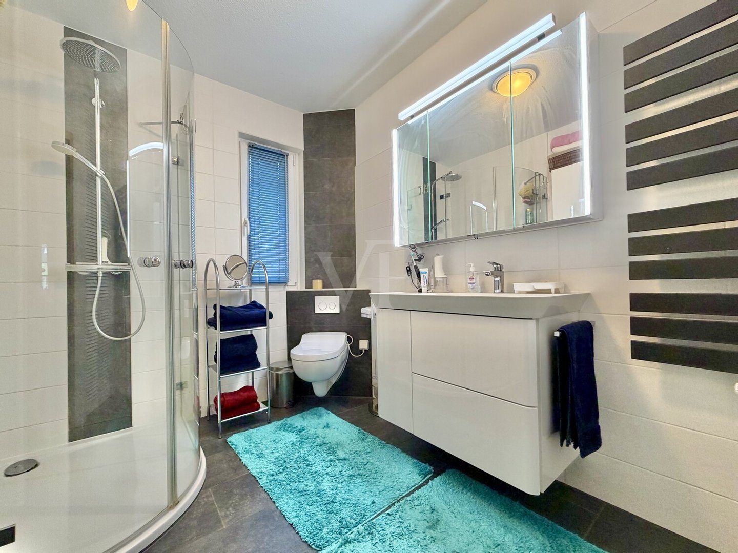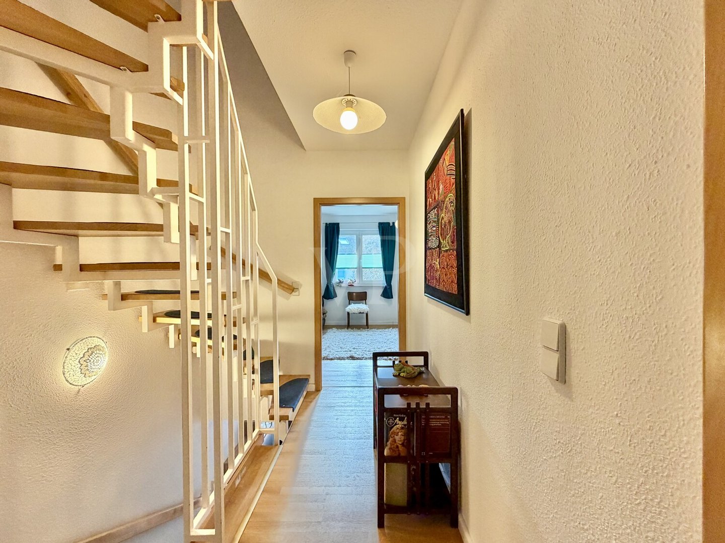 Über eine harmonisch integrierte Treppe gelangen Sie ins lichtdurchflutete Obergeschoss, das nachträglich mit feinem Parkett ausgestattet wurde. Zwei großzügige Zimmer bieten vielfältige Nutzungsmöglichkeiten – eines davon mit praktischer Ankleide. Das ebenfalls modernisierte Duschbad präsentiert sich elegant und funktional zugleich und verwöhnt mit einem Aquaclean-WC (Bidet- und WC-Funktion). Weitere Annehmlichkeiten sind die Unterbringung von Waschmaschine und Trockner.