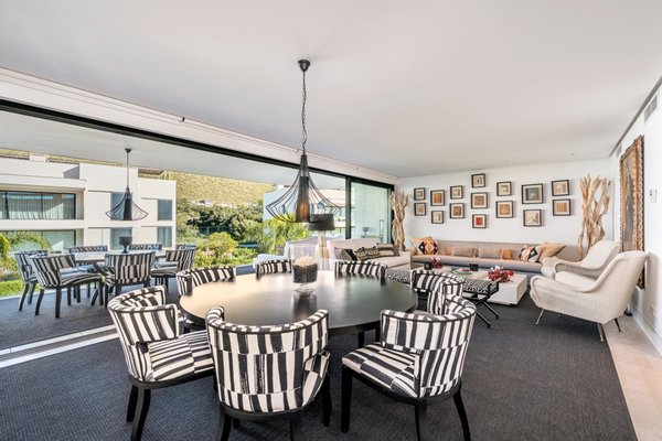 Die Wohnung verfügt über ein helles und großzügiges Wohn- und Esszimmer mit bodentiefen Schiebetüren, die auf eine weitläufige Terrasse führen. Von hier aus genießt man den Blick auf die gepflegten Gemeinschaftsgärten und den Poolbereich. Die separate, voll ausgestattete Küche ist mit hochwertigen Einbaugeräten versehen und bietet viel Stauraum und Arbeitsfläche.