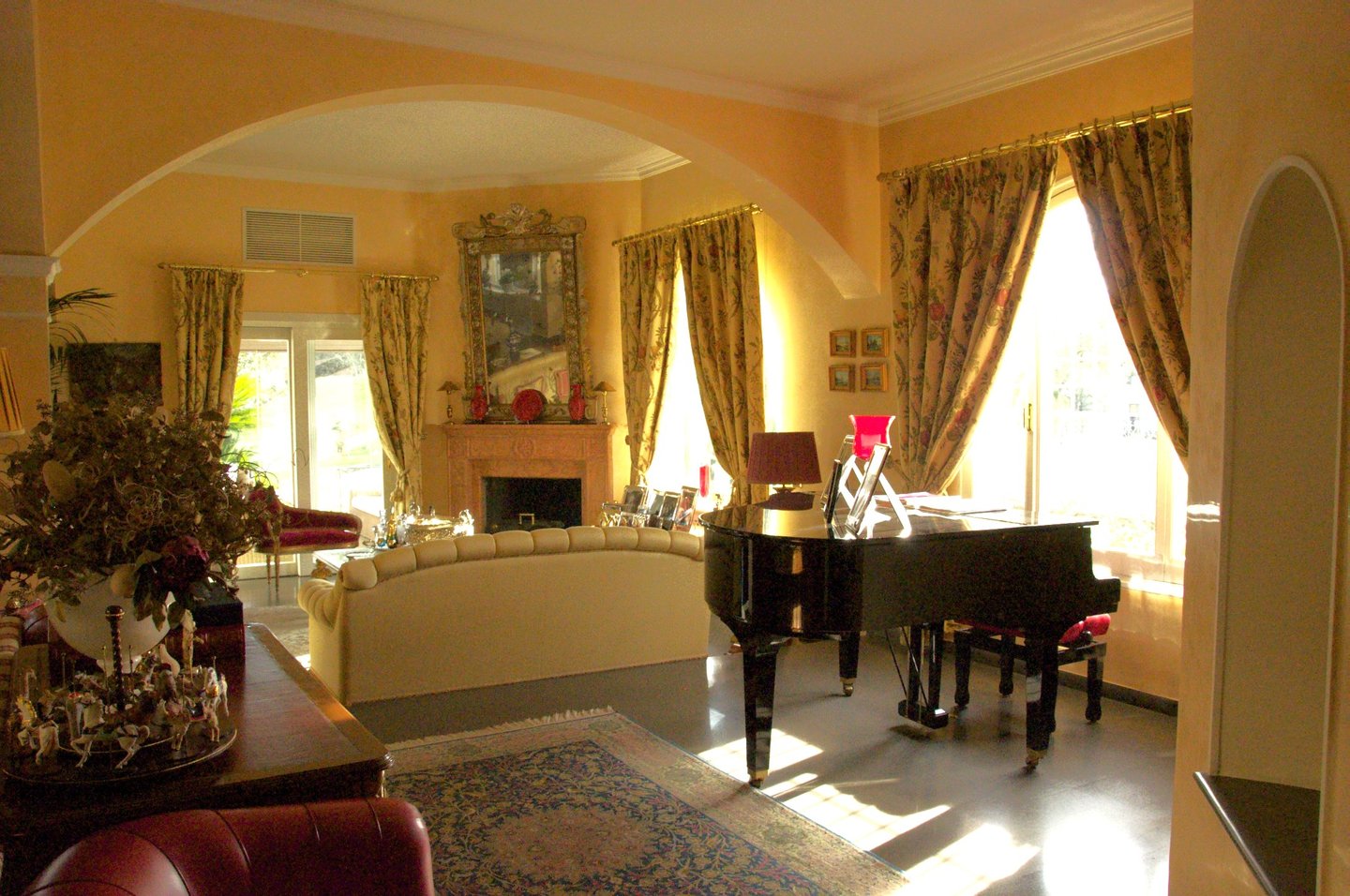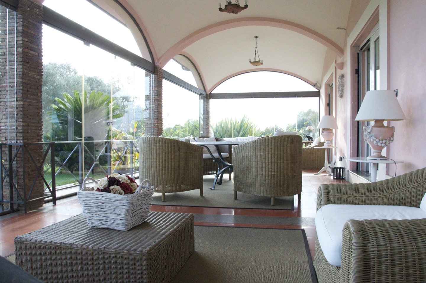 Das Herzstück des Komplexes ist eine zweistöckige Villa von etwa 500 Quadratmetern, ein authentisches architektonisches Meisterwerk. Im Erdgeschoss befinden sich eine doppelte Eingangshalle, eine prächtige Innenterrasse, ein großes Doppelwohnzimmer mit Kamin, ein Esszimmer, drei Schlafzimmer mit eigenem Bad, eine Suite mit Kamin, begehbarer Kleiderschrank und privates Bad sowie eine voll ausgestattete Küche mit Essbereich und Speisekammer. Das Obergeschoss bietet ein zusätzliches Schlafzimmer mit Bad und eine wunderschöne Terrasse mit Panoramablick auf den Park. Die hochwertigen Oberflächen, wie Marmorböden in den Wohnbereichen und Parkettböden in den Schlafzimmern, werden durch moderne Annehmlichkeiten wie Klimaanlage und eine Alarmanlage ergänzt.