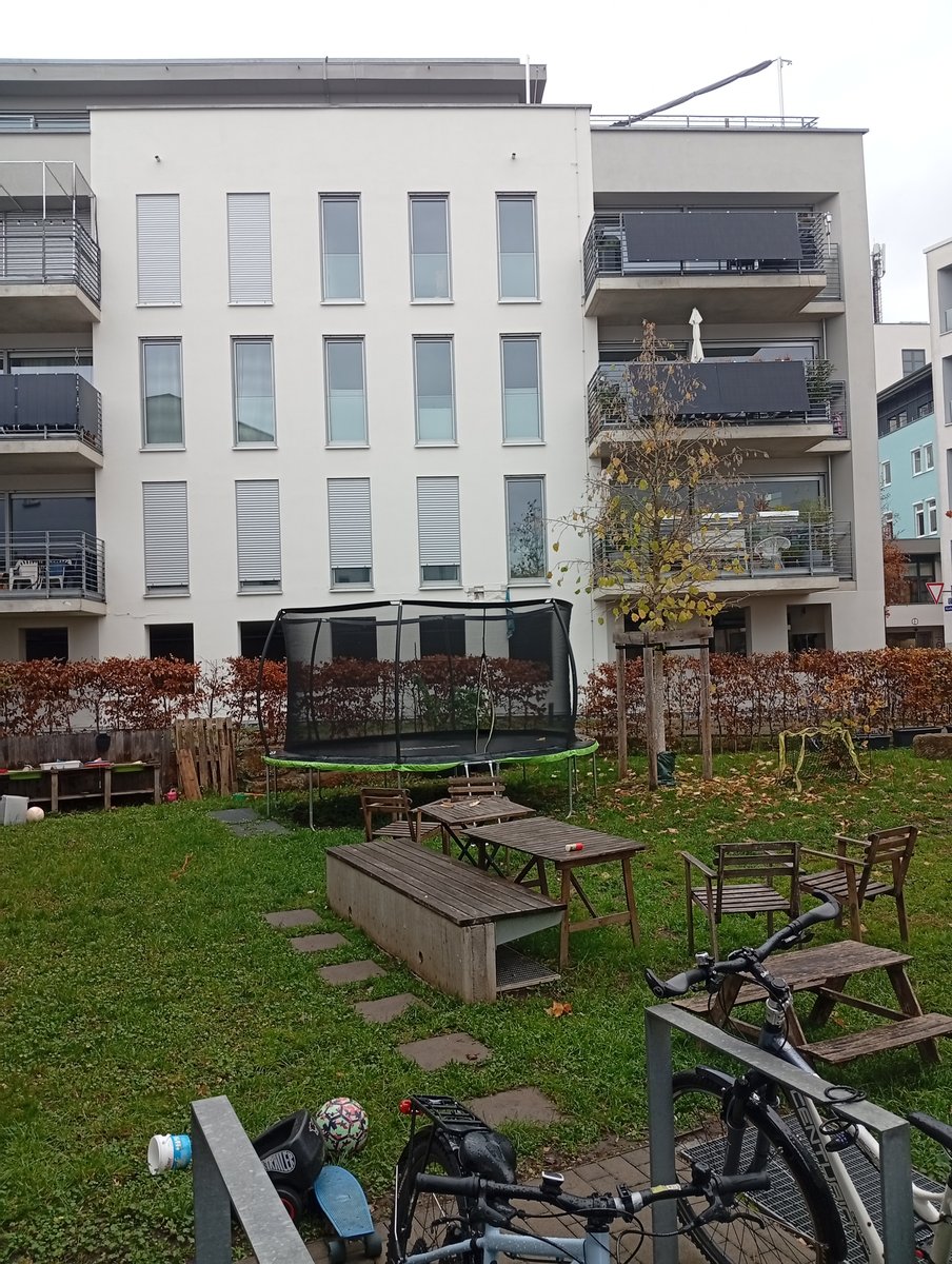 Kleines Grundstück (ca. 100 m² Rasenfläche) plus großer Gemeinschaftsgarten mit Spielgeräten und Trampolin