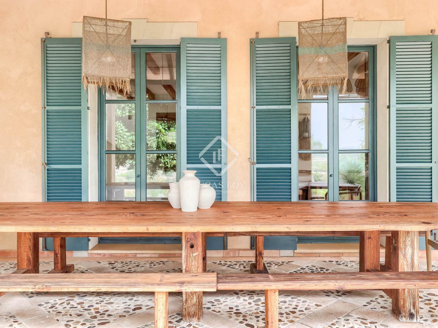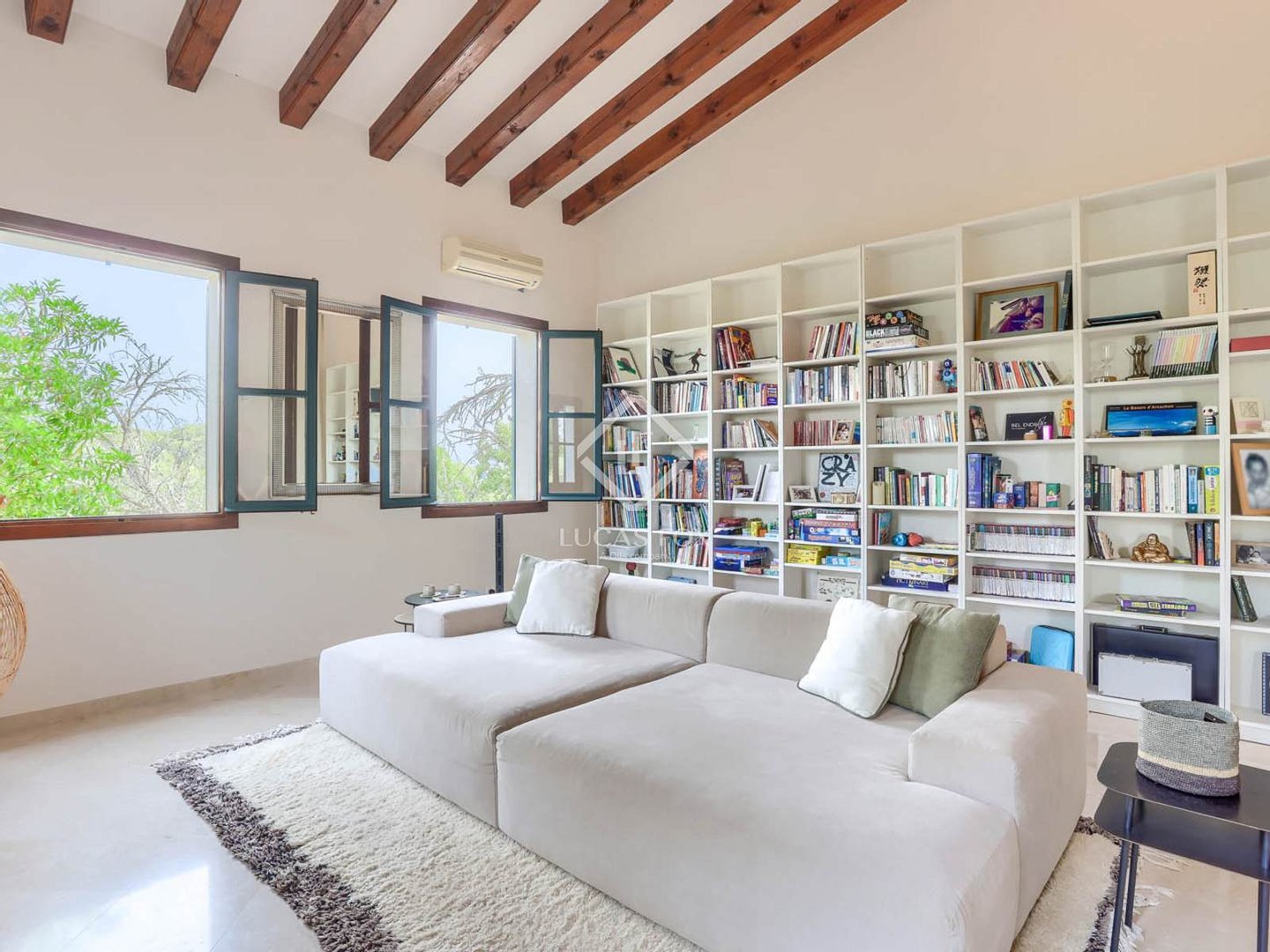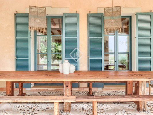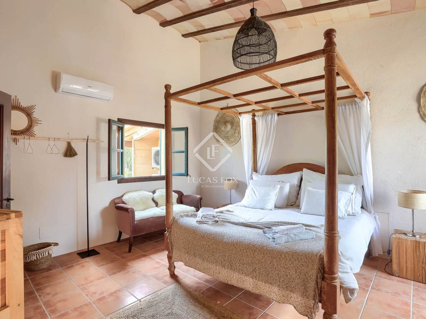 Splendid, fully renovated property offering privacy and breathtaking views of the surrounding nature. A private access road leads to the property, situated in an elevated position, protected from prying eyes. The main house, built on two levels, boasts a spectacular space on the ground floor, thanks to its unusual ceiling height and exposed beams. The kitchen was custom-designed with high-quality materials (natural stone and wood) and equipped with high-end appliances: Bora hob, Gaggenau refrigerator, and Miele appliances. From the central island you can enjoy a unique perspective: on one side, nature and the light that generously penetrates through numerous windows, and then you access the dining room, followed by a spacious and cozy living room with a stone fireplace, and a very comfortable television corner, accompanied by a large library. This first floor is completed by a guest toilet, a technical room, and a large functional laundry room. The upper floor is accessed by a majestic Art Deco-style staircase, where there are two bedrooms with custom-made dressing rooms, a complete bathroom with toilet, and a huge master suite with a large dressing room, all connected to a micro-cement bathroom with shower, bathtub and toilet. All rooms are equipped with air conditioning and ceiling fans. From the living room you have access to a covered terrace offering breathtaking views of the countryside and olive trees. The 14,587 m² plot features a large 100 m² garage with space for three cars and three guest houses. A uniquely sized heated saltwater pool (6x12 m) creates an idyllic and relaxing atmosphere, surrounded by pleasant relaxation areas and lush Mediterranean vegetation. The small houses offer four additional bedrooms with private bathrooms and several other possible uses. The estate is equipped with new solar panels and new lithium batteries, making it completely self-sufficient in electricity and water, thanks to its legal well. The entire estate also has gas underfloor heating, guaranteeing optimal comfort all year round. This unique property offers all the advantages for year-round living, just minutes from the access to the Manacor – Palma road and the charming village of Montuïri, with all its services (supermarkets, hardware store, restaurants, pharmacy, post office, doctors, veterinarians), in a peaceful and exceptional environment.
