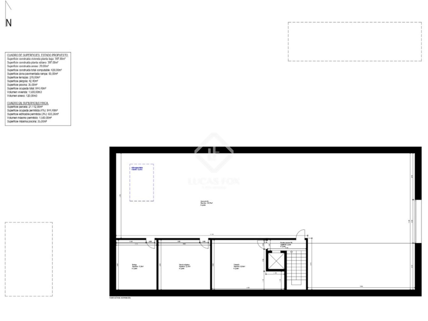 Dieses moderne Einfamilienhaus besticht durch Eleganz und Funktionalität. Es steht auf einem großzügigen Grundstück von 21.112 Quadratmetern. Die bebaute Fläche beträgt 1.136 Quadratmeter und umfasst Erdgeschoss, Keller, Pool, Terrassen und einen Anbau. Das Untergeschoss erstreckt sich über 397 Quadratmeter und dient als Hauswirtschafts- und Servicefläche. Es umfasst eine geräumige Garage mit ausreichend Platz für mehrere Fahrzeuge. Daran angrenzend befinden sich eine Waschküche, ein Maschinenraum für technische Geräte und eine Bodega, ideal zur Weinlagerung. Ein Trinkwassertank mit 10 Kubikmetern Fassungsvermögen befindet sich ebenfalls auf dieser Ebene. Die vertikale Erschließung erfolgt über eine Treppe, die mit dem darüber liegenden Erdgeschoss verbunden ist. Das Erdgeschoss, dessen Grundfläche dem Kellergeschoss entspricht, ist den Hauptwohnräumen gewidmet. Obwohl detaillierte Raumaufteilungen in diesem Teil des Plans nicht enthalten sind, ist das Obergeschoss für Küche, Wohn- und Esszimmer, Schlafzimmer und andere Hauptfunktionen des Hauses vorgesehen. Große Öffnungen und der direkte Zugang zum Außenbereich verstärken den fließenden Übergang zwischen Innen- und Außenräumen. Der Außenbereich des Anwesens ist auf Komfort und Freizeit ausgelegt. Es verfügt über 276 Quadratmeter Terrassen und einen 35 Quadratmeter großen Swimmingpool, der als zentrales Element des Außenwohnbereichs dient. Eine gepflasterte Rampe verbindet die verschiedenen Außenebenen und erleichtert den Zugang. Das Haus vereint architektonische Raffinesse mit einem starken praktischen Kern und maximiert das Potenzial des Grundstücks unter Einhaltung der Bauvorschriften. Es ist eine Residenz für modernes Wohnen und verbindet raffinierte Ästhetik mit großzügigen, funktionalen Räumen. Die bereitgestellten Informationen dienen nur zur Orientierung und können während des Projekts Änderungen unterliegen.