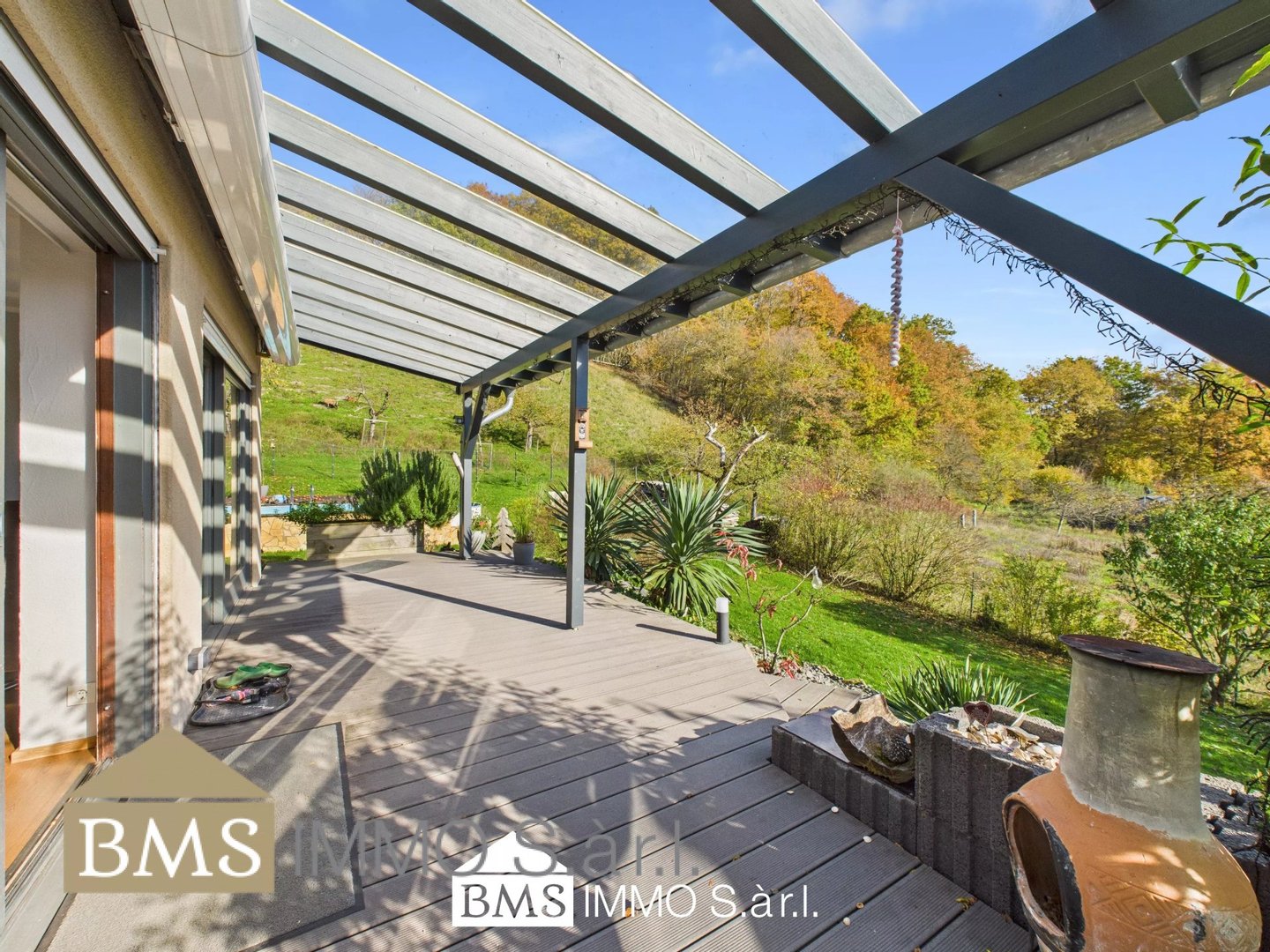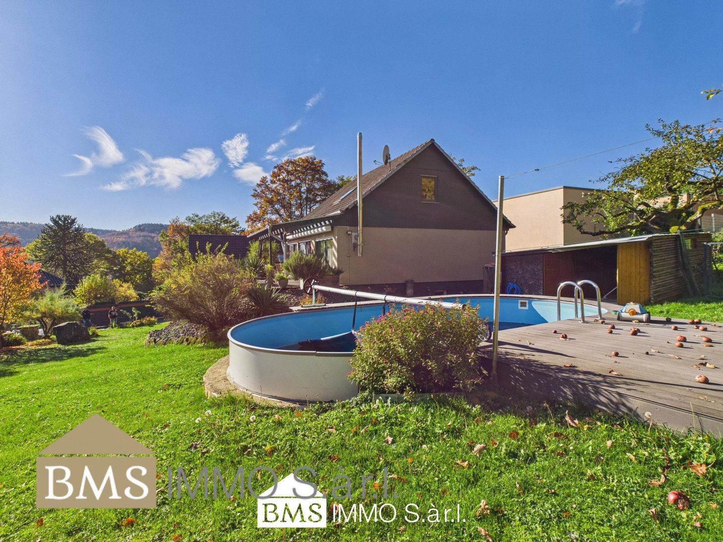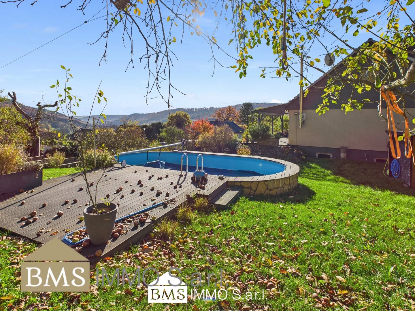 Rechts vom Haus erwartet Sie an sonnigen Tagen bereits der Außenpool mit einem Fassungsvermögen von 30.000 l. Auch dieser Bereich wurde mit WPC-Dielen eingefasst und lädt dazu ein, geruhsame Sonnenstunden zu genießen.