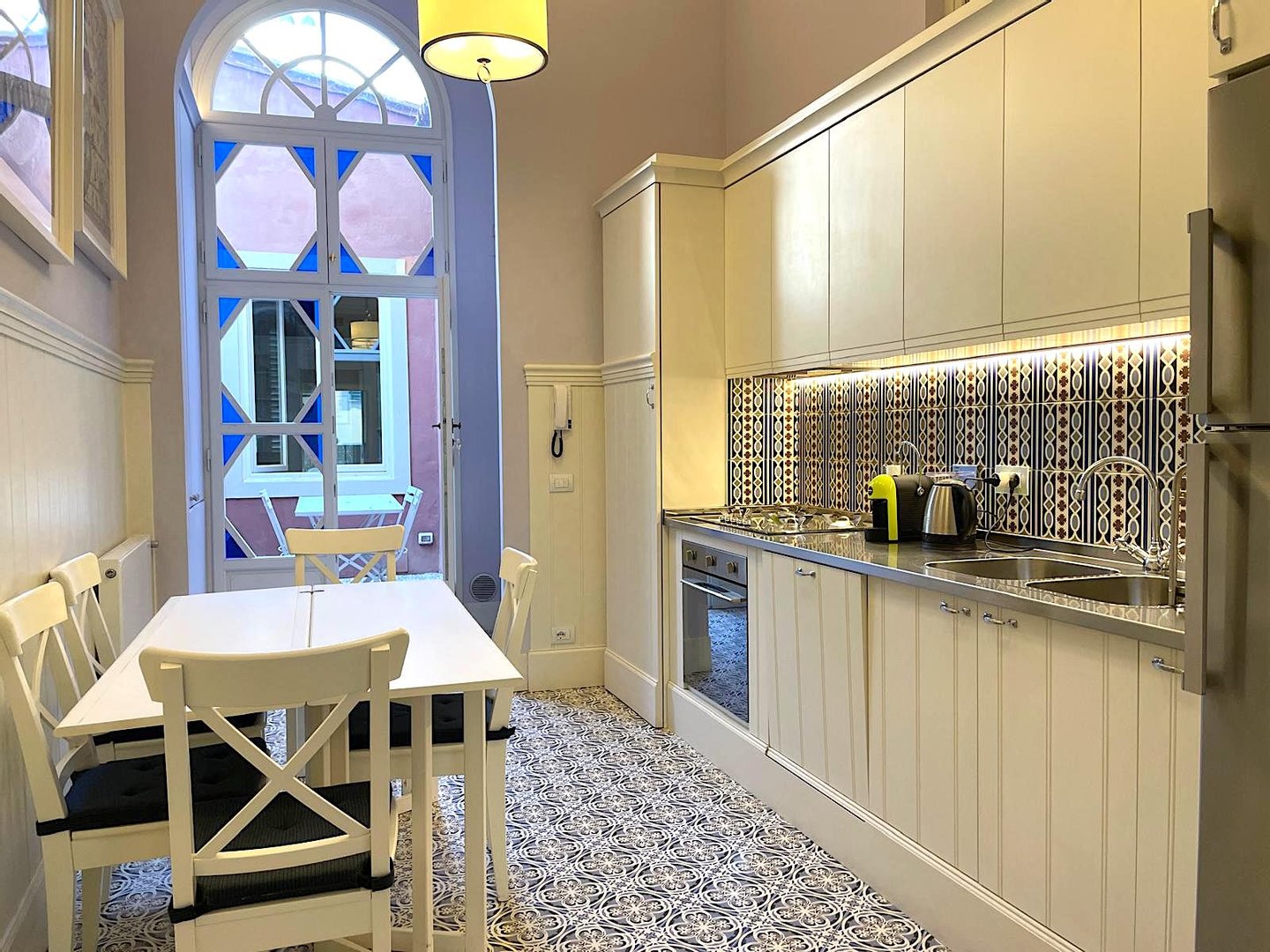 Fröhlich mit geometrischen Tapeten dekoriert und zuvor mit bunten Stoffen und unterhaltsamer Kunst ausgestattet, wie auf den Fotos zu sehen, bietet dieses Anwesen ein wunderbares Zuhause in einer zunehmend begehrten Gegend von Florenz.