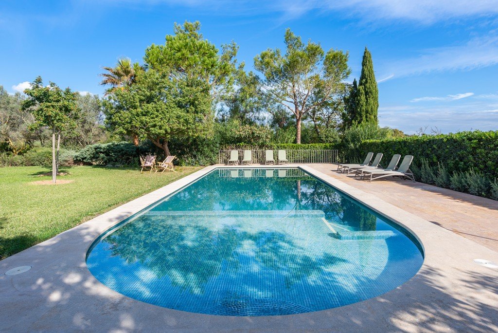 Die wunderschön angelegten Gärten sind perfekt gepflegt, und der großzügige Pool übertrifft die übliche Größe – ein Vorzug aus der Zeit der Errichtung um das Jahr 2005, als noch ein größeres Bauvolumen erlaubt war.
